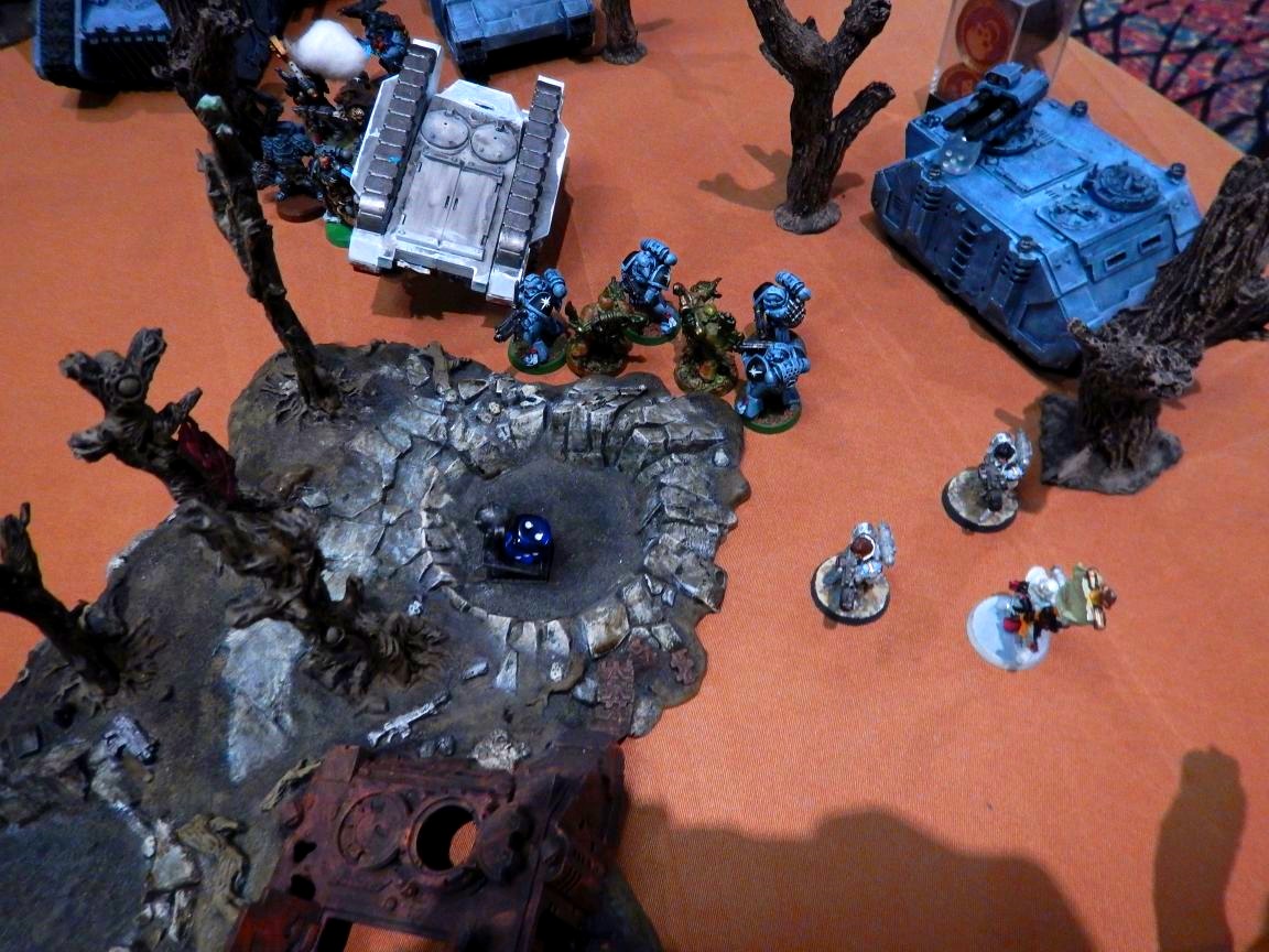 The Iron Warriors move up to take an objective marker. The Night Lords Lord deep strikes in with a squad of terminators to take back the left flank.